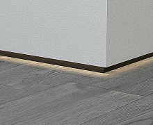 Особенности монтажа: Уложите ламинат так, чтобы его край заходил под будущий профиль, но не упирался в стену. Нанесите «жидкие гвозди» зигзагом на тыльную сторону профиля. Приклейте профиль к ровной стене прямо поверх ламината. Заштукатурьте верхнюю кромку профиля, чтобы она слилась со стеной. Зашпаклюйте и покрасьте стену как обычно.