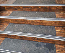 Способ монтажа: алюминиевый порожек без вставки крепится в проем между двумя напольными покрытиями или на ступени при помощи саморезов (идут в комплекте). Затем прорезиненную ПВХ вставку нужно нагреть строительным или обычным феном, либо подержать в горячей воде, чтобы материал стал мягче и легче вошел в паз профиля.